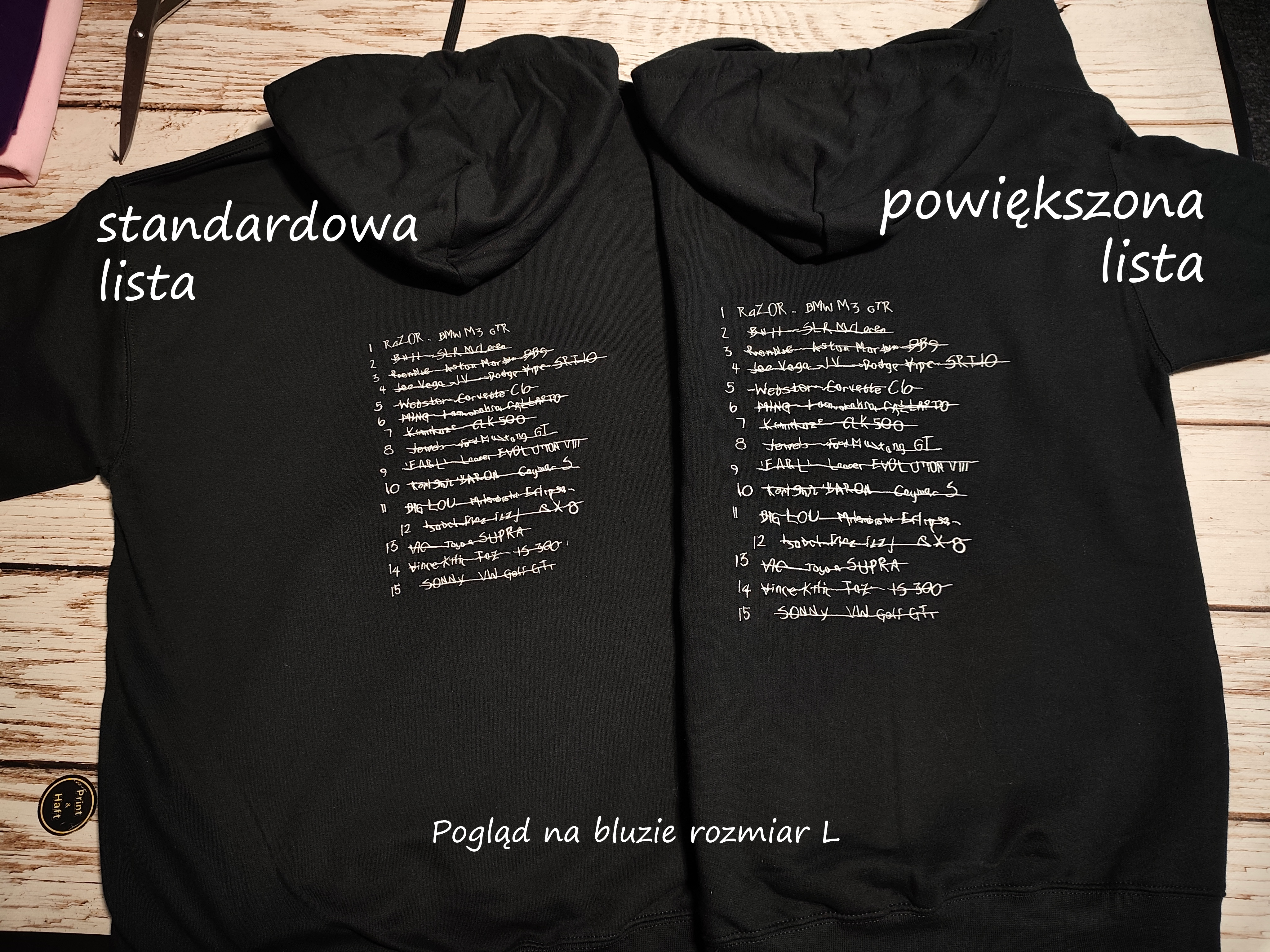 Możliwość wyhaftowania/zmiany pierwszego miejsca na liście na dowolne - opcjonalnie dodaj do koszyka - napisz treść (ksywa/imię - model auta) w wiadomości do nas.
